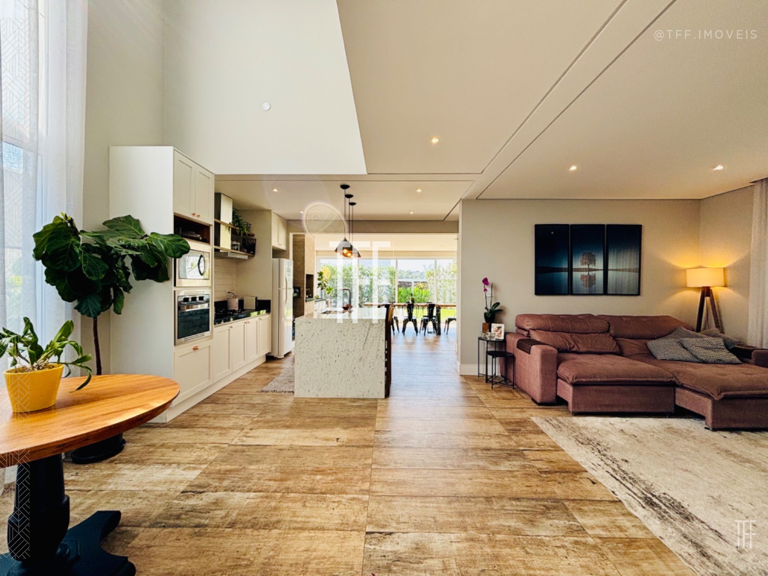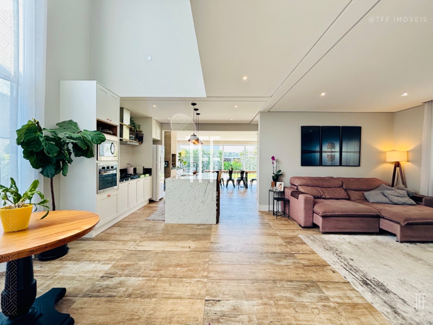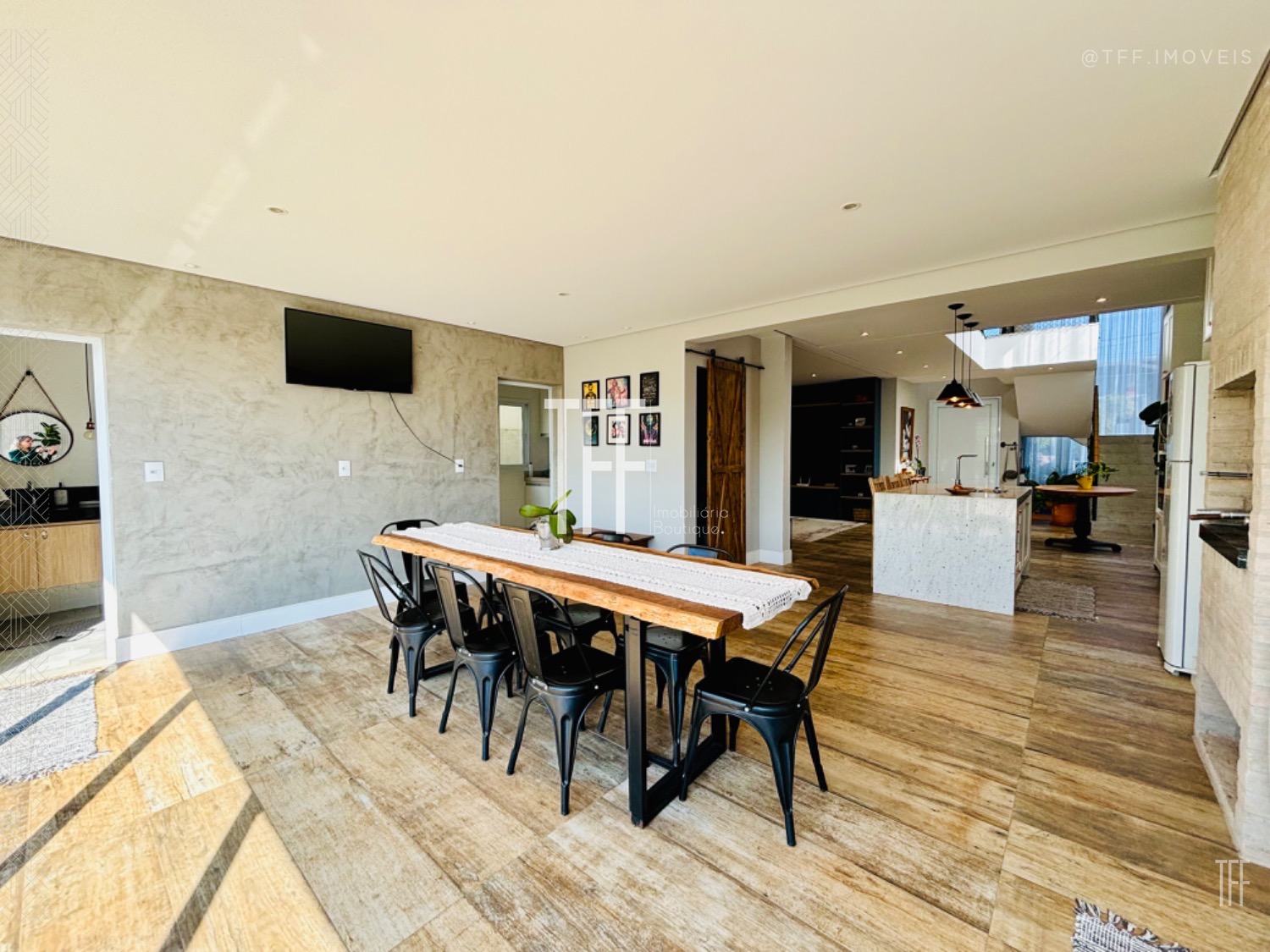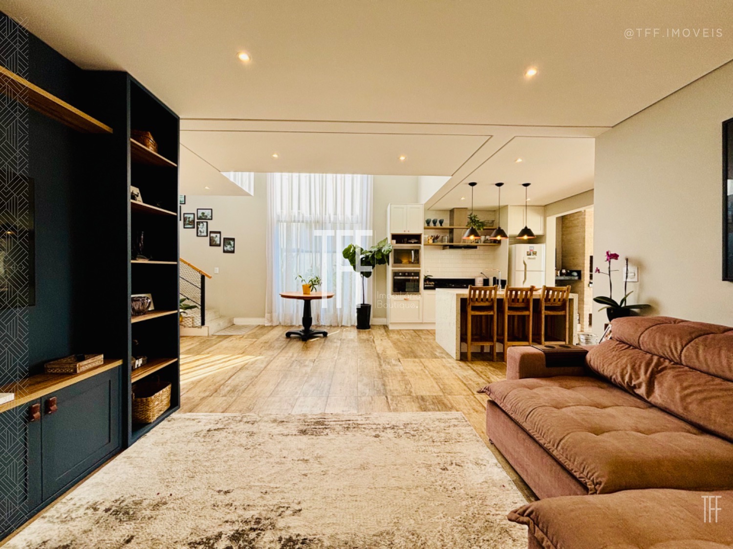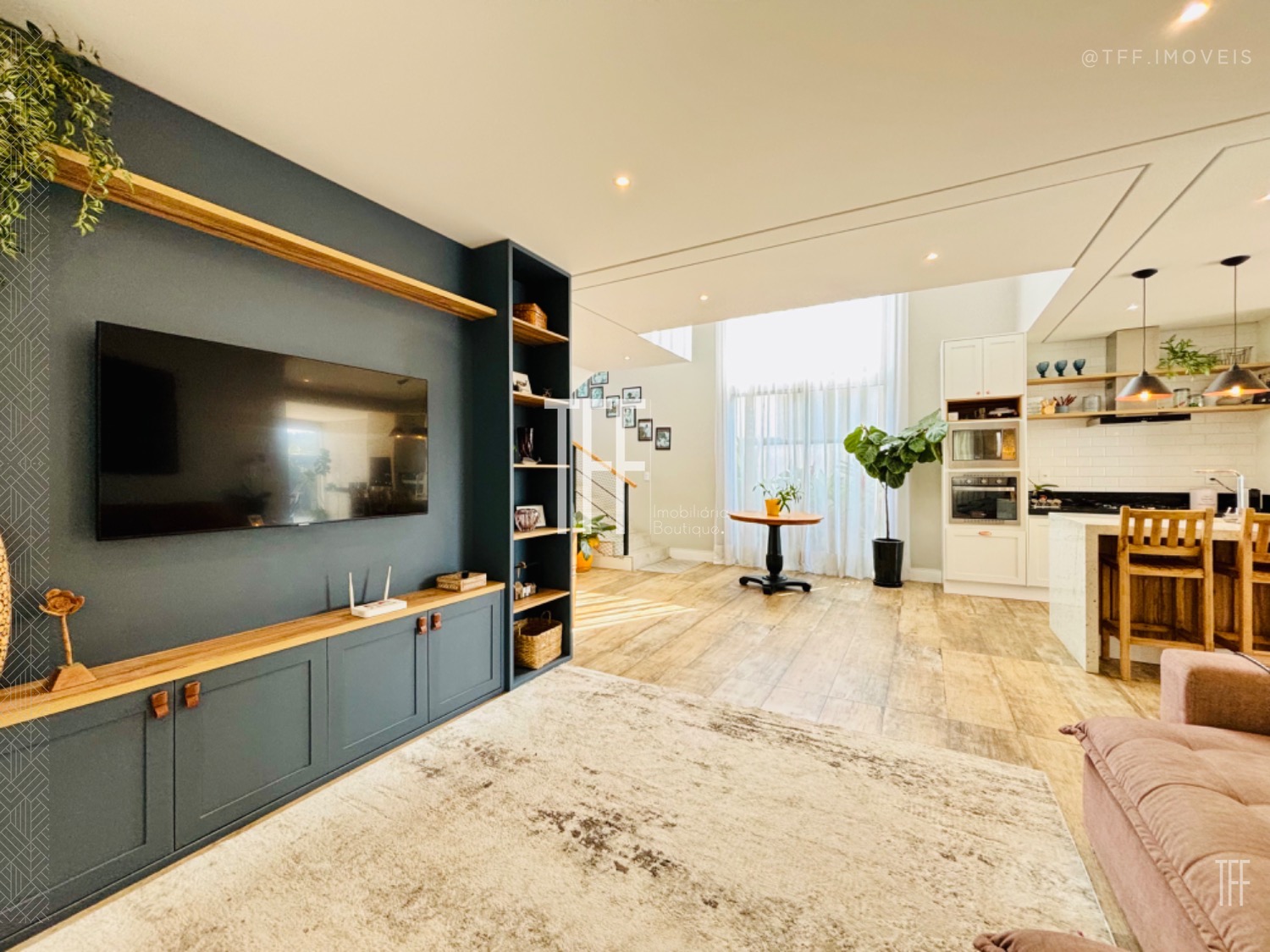 -Living integrado com ambientes de estar, jantar e TV
