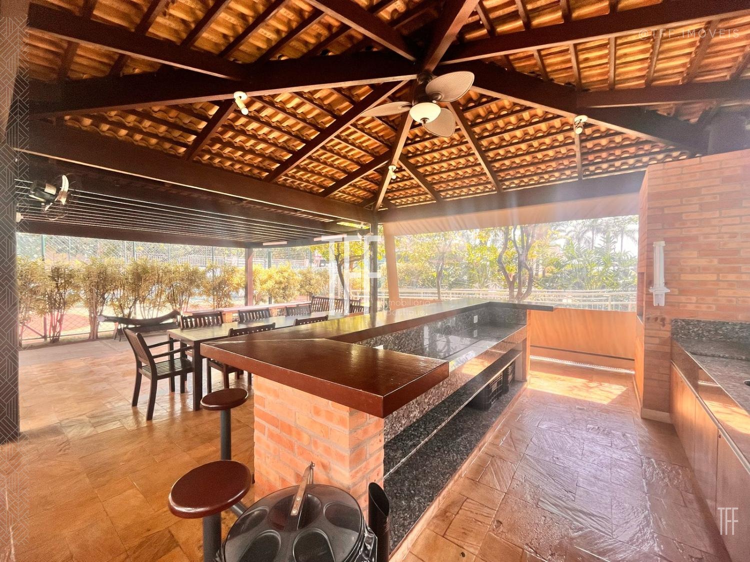 Uma área gourmet com churrasqueira e um amplo quintal.